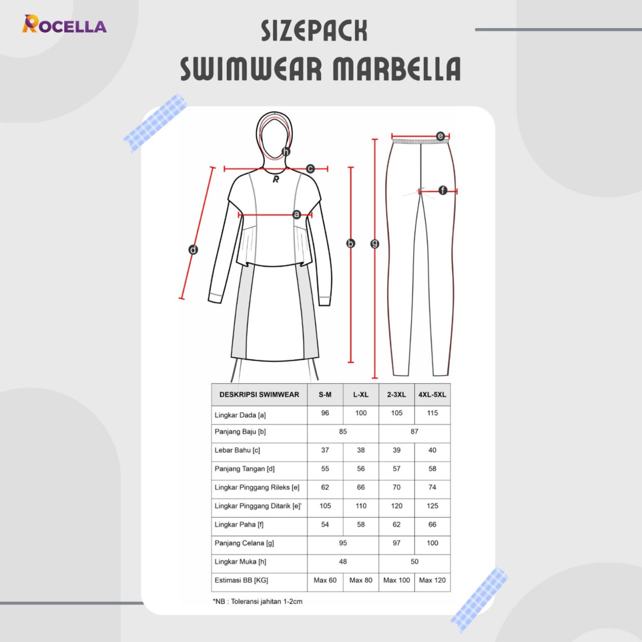 Beikut adalah ukuran dari baju renang muslimah premium Rocella Swimwear Marbella.