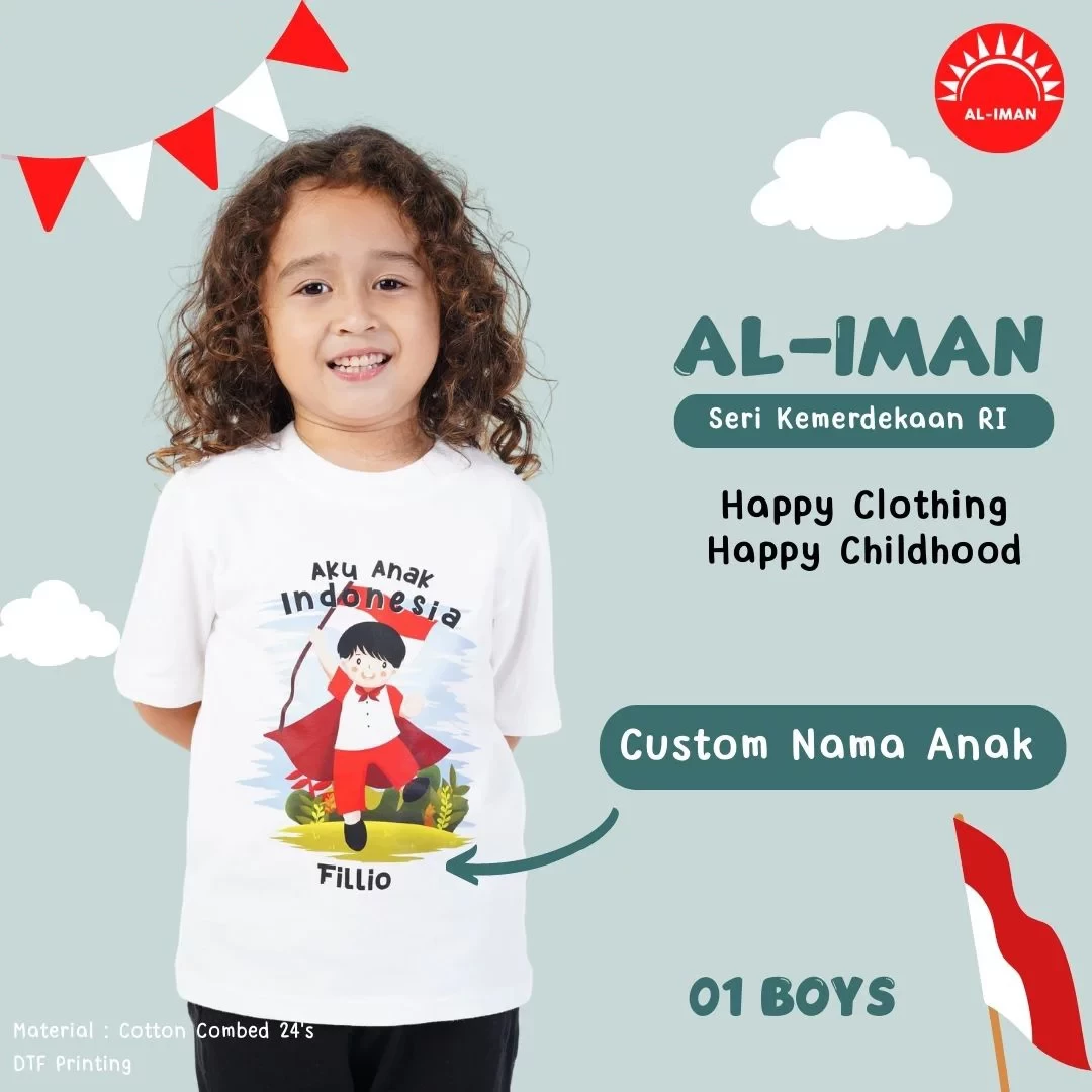 Kaos anak al-iman seri cinta Indonesia - BOYS01 - lengan pendek, kaos anak dengan tema hari kemerdekaan. Menggunakan bahan cotton combed 24s yang berkualitas, halus, lembut, dan nyaman dipakai. Sablon menggunakan tinta non-toxic berstandar internasional sehingga aman dan ramah lingkungan sedangkan pewarna yang digunakan sudah bersertifikat internasional keamanan pakaian.