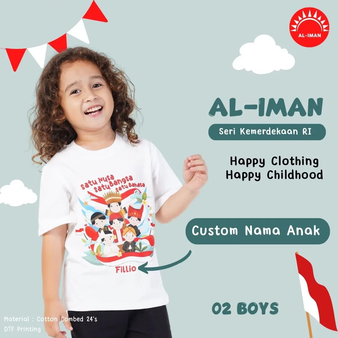 Kaos anak al-iman seri cinta Indonesia - BOYS02 - lengan pendek, kaos anak dengan tema hari kemerdekaan. Menggunakan bahan cotton combed 24s yang berkualitas, halus, lembut, dan nyaman dipakai. Sablon menggunakan tinta non-toxic berstandar internasional sehingga aman dan ramah lingkungan sedangkan pewarna yang digunakan sudah bersertifikat internasional keamanan pakaian.