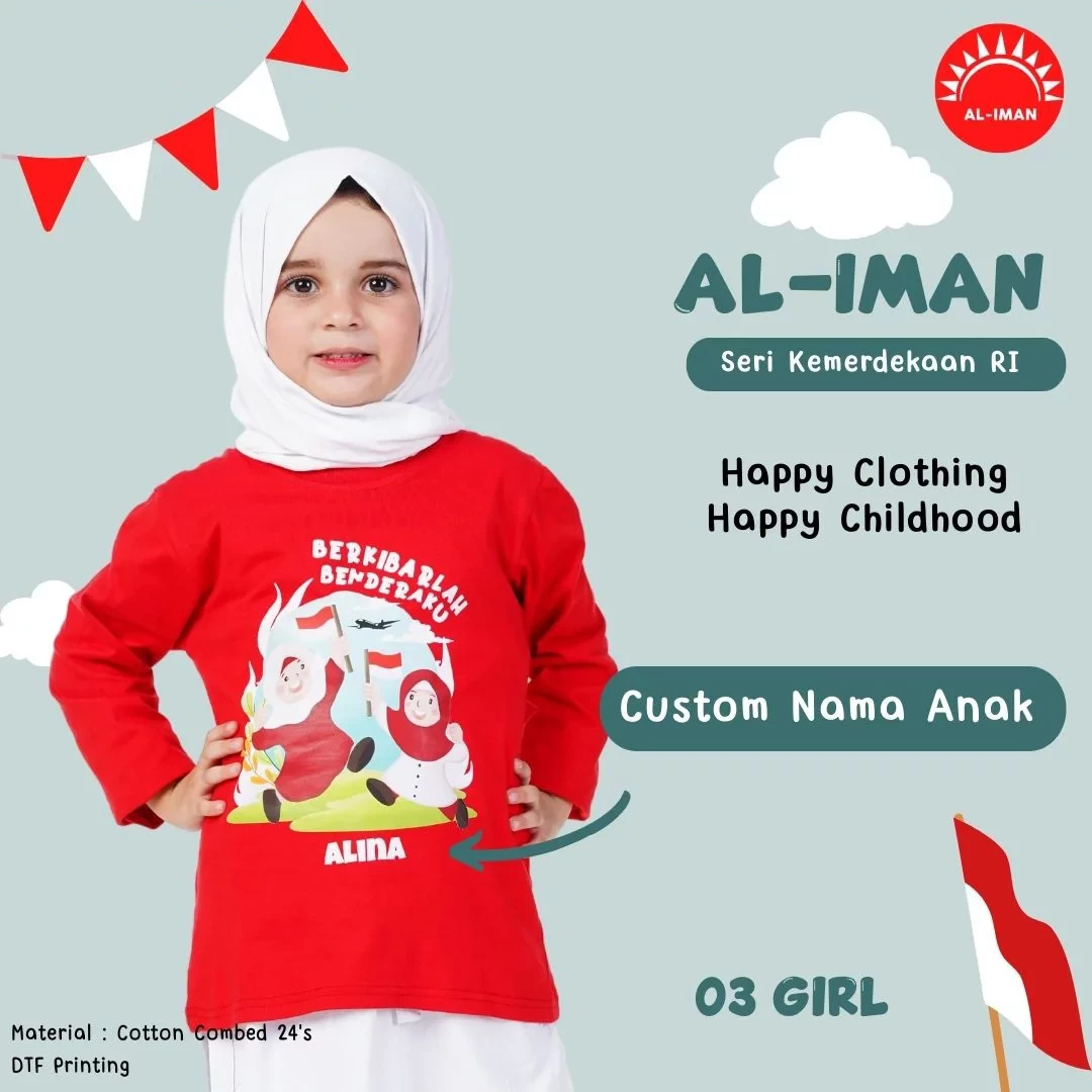 Kaos anak al-iman seri cinta Indonesia - GIRLS03 - lengan panjang, kaos anak dengan tema hari kemerdekaan. Menggunakan bahan cotton combed 24s yang berkualitas, halus, lembut, dan nyaman dipakai. Sablon menggunakan tinta non-toxic berstandar internasional sehingga aman dan ramah lingkungan sedangkan pewarna yang digunakan sudah bersertifikat internasional keamanan pakaian.
