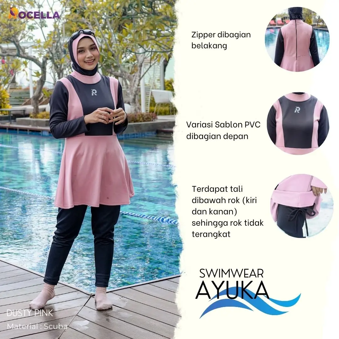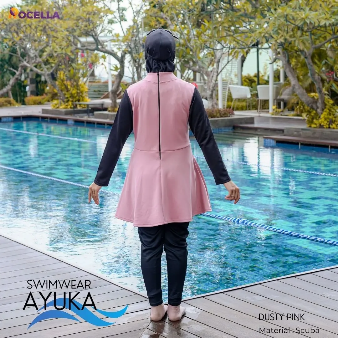 Rocella Swimwear Ayuka - Dusty Pink, baju renang muslimah premium yang terdiri dari 3 bagian yaitu atasan (baju renang), bawahan (celana renang), dan hijab. Kombinasi 3 bagian tersebut menjadikannya seluruh tubuh tertutup dan cocok digunakan oleh para muslimah untuk berenang.Swimwear Ayuka menggunakan resleting pada bagian belakang dan terdapat tali pada atasan di bagian bawah kanan dan kiri untuk mencegah atasan terangkat.