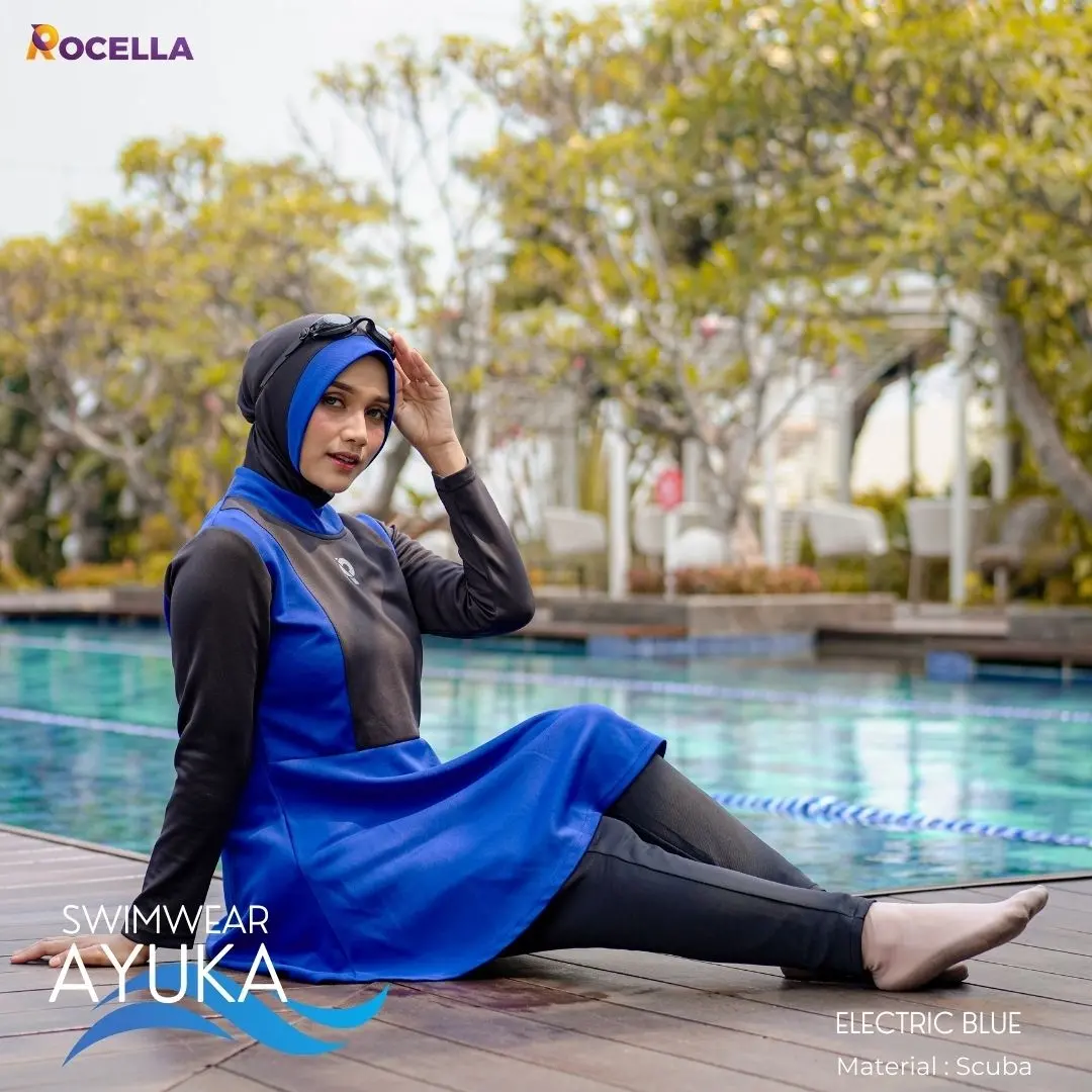 Rocella Swimwear Ayuka - Electric Blue, baju renang muslimah premium yang terdiri dari 3 bagian yaitu atasan (baju renang), bawahan (celana renang), dan hijab. Kombinasi 3 bagian tersebut menjadikannya seluruh tubuh tertutup dan cocok digunakan oleh para muslimah untuk berenang.Swimwear Ayuka menggunakan resleting pada bagian belakang dan terdapat tali pada atasan di bagian bawah kanan dan kiri untuk mencegah atasan terangkat.