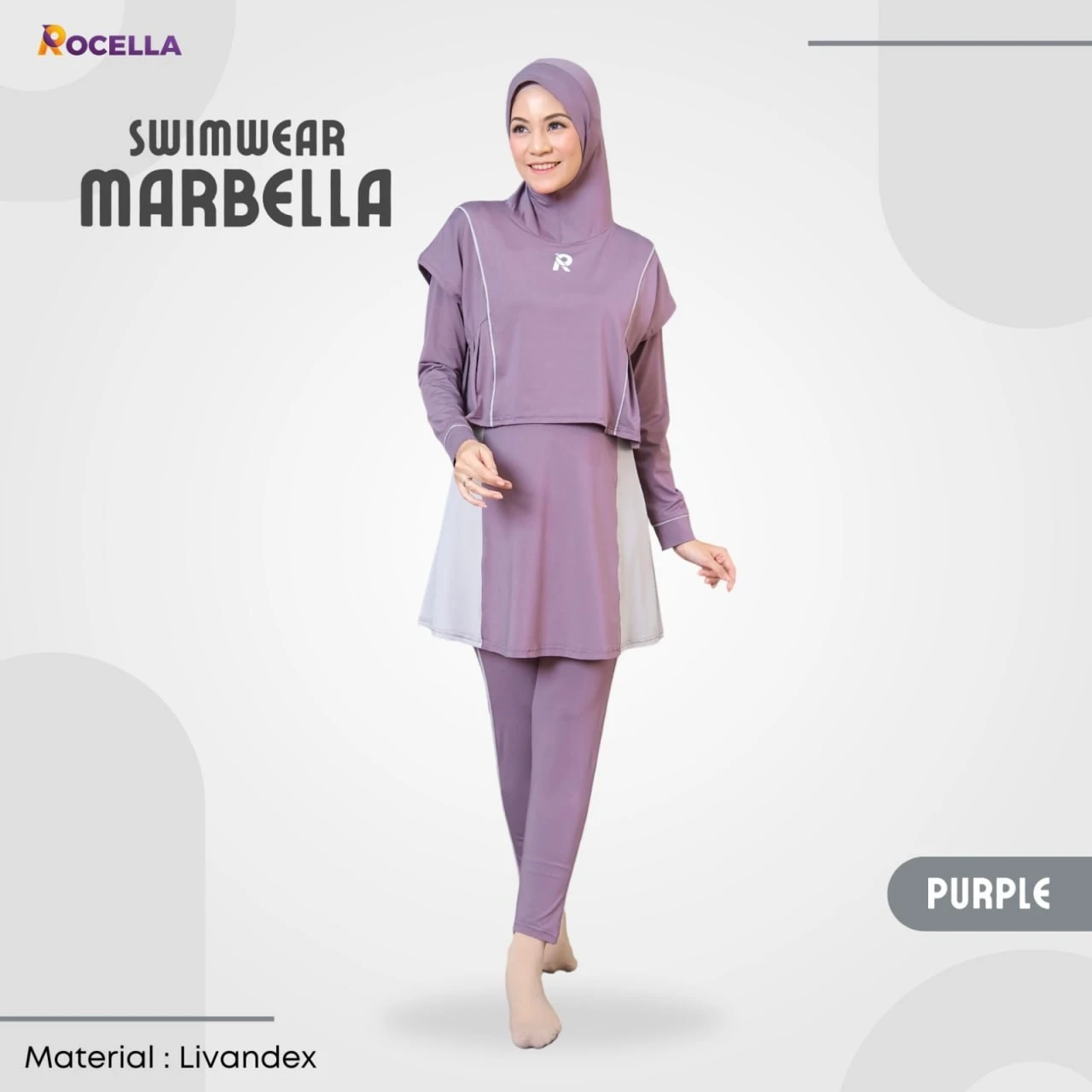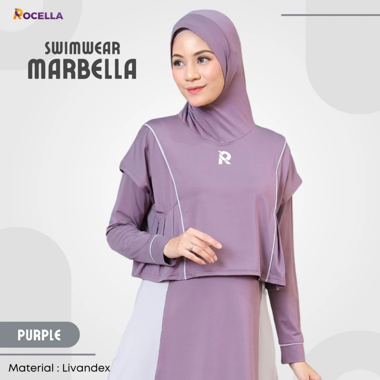 Rocella Swimwear Marbella - Ungu, setelan baju renang muslimah premium yang terdiri dari baju renang dan hijab yang dijaiht menyatu, serta celana renang. Kombinasi 3 bagian tersebut menjadikannya seluruh tubuh tertutup dan cocok digunakan oleh para muslimah untuk berenang. Swimwear Marbella dilengkapi dengan outer yang menutup bagian dada dengan detail variasi lis kombinasi dan lipit di sisi kanan-kiri yang memberi kesan sporty namun tetap anggun, pada bagian dalam layer dilengkapi dengan tali pengait dan kancing untuk mencegah outer terangkat.