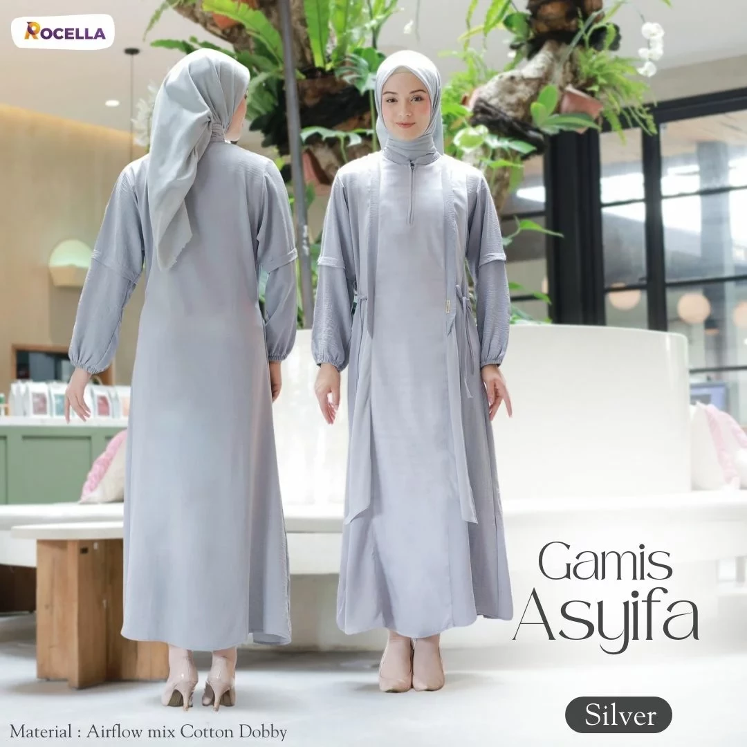 Gamis Asyifa Silver, gamis untuk wanita muslim warna silver yang cantik dengan desain kekinian. Gamis Asyifa mempunyai beberapa kelebihan antara lain, kerah sanghai, zipper di depan sehingga memudahkan saat memakai dan cocok untuk ibu-ibu yang sedang menyusui. Ujung lengan menggunakan karet sehingga memudahkan saat berwudhu. Pada bagian samping kanan dan kiri terdapat tali yang menambah kecantikan gamis tersebut.