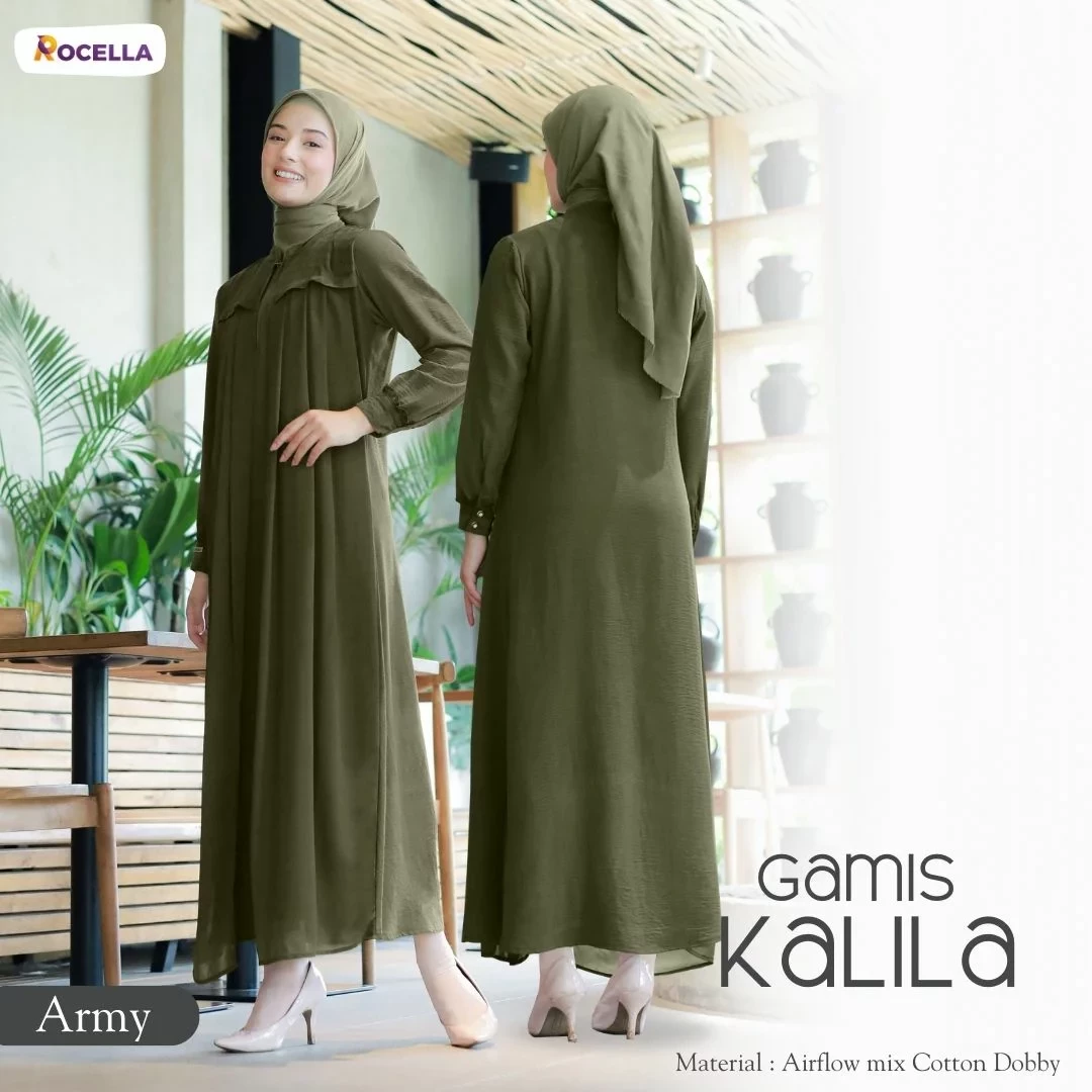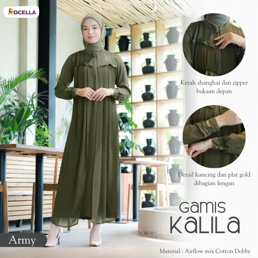 Rocella Gamis Kalila Army, gamis wanita dengan desain yang simple dan dilengkapi dengan layer di bagian depan. Zipper terletak di bagian depan sehingga memudahkan saat memakai dan cocok untuk ibu yang sedang menyusui. Ujung lengan menggunakan manset sehingga memudahkan ketika berwudhu.