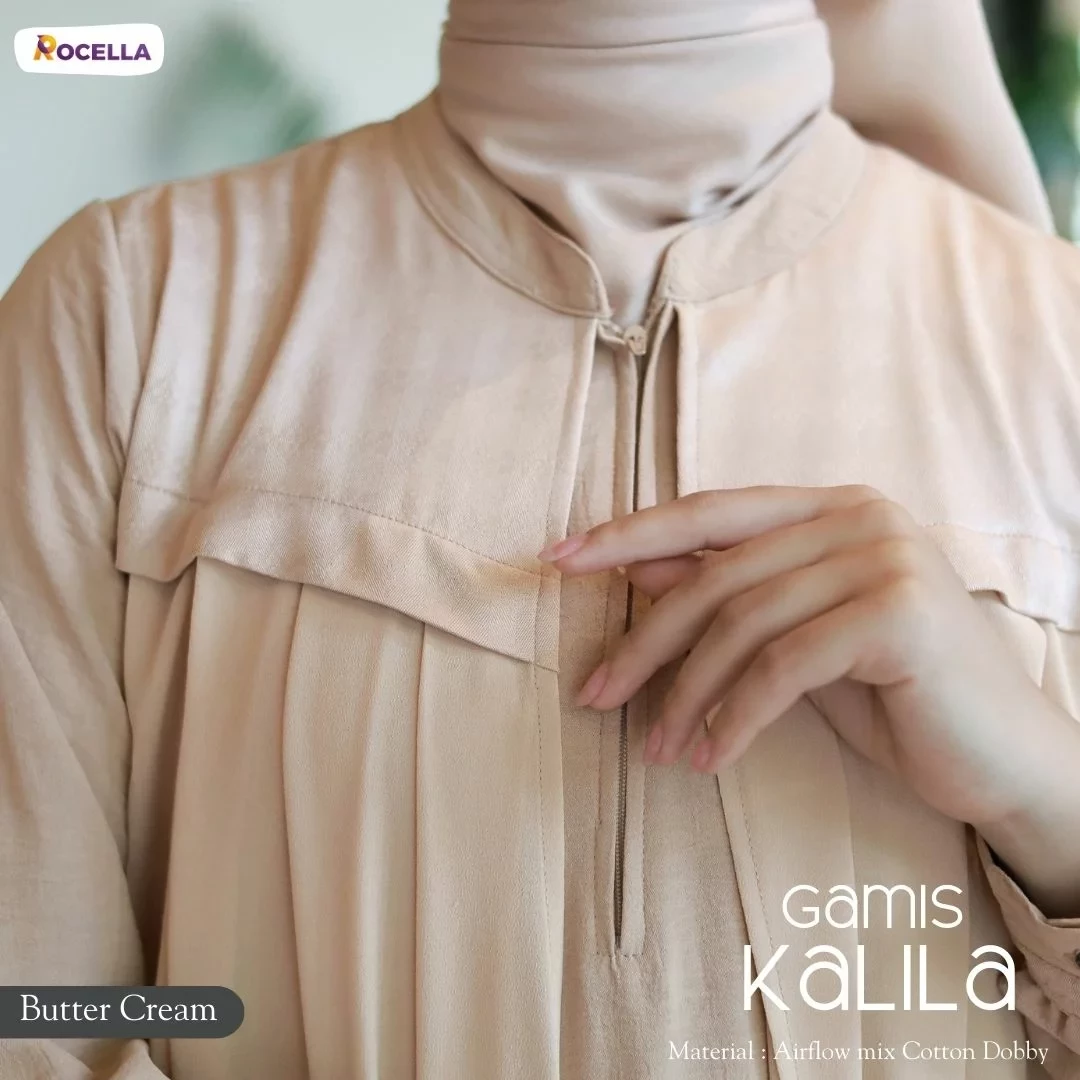 Rocella Gamis Kalila Butter Cream, gamis wanita dengan desain yang simple dan dilengkapi dengan layer di bagian depan. Zipper terletak di bagian depan sehingga memudahkan saat memakai dan cocok untuk ibu yang sedang menyusui. Ujung lengan menggunakan manset sehingga memudahkan ketika berwudhu.