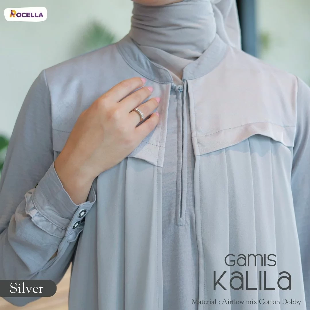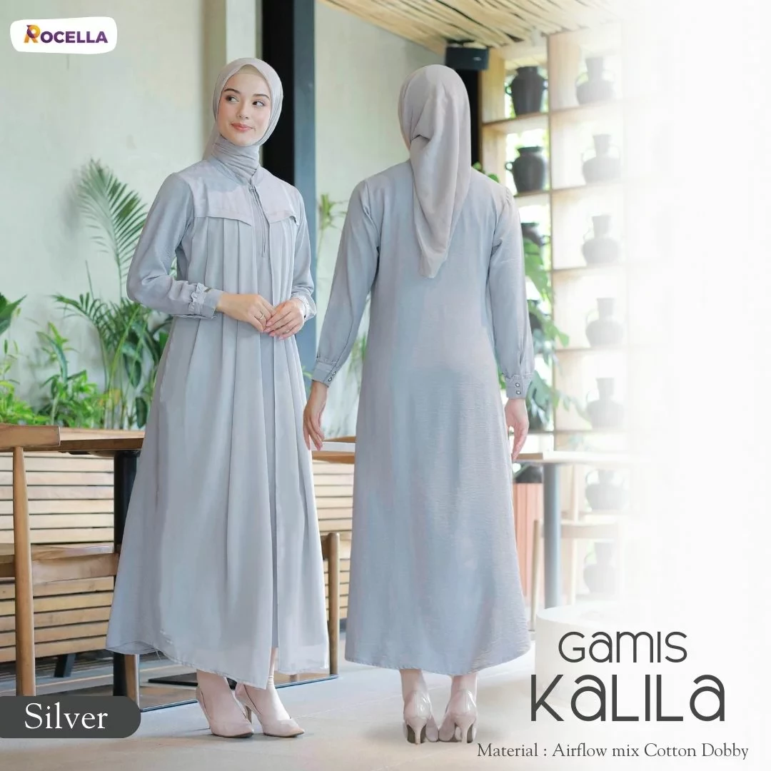Rocella Gamis Kalila Silver, gamis wanita dengan desain yang simple dan dilengkapi dengan layer di bagian depan. Zipper terletak di bagian depan sehingga memudahkan saat memakai dan cocok untuk ibu yang sedang menyusui. Ujung lengan menggunakan manset sehingga memudahkan ketika berwudhu.