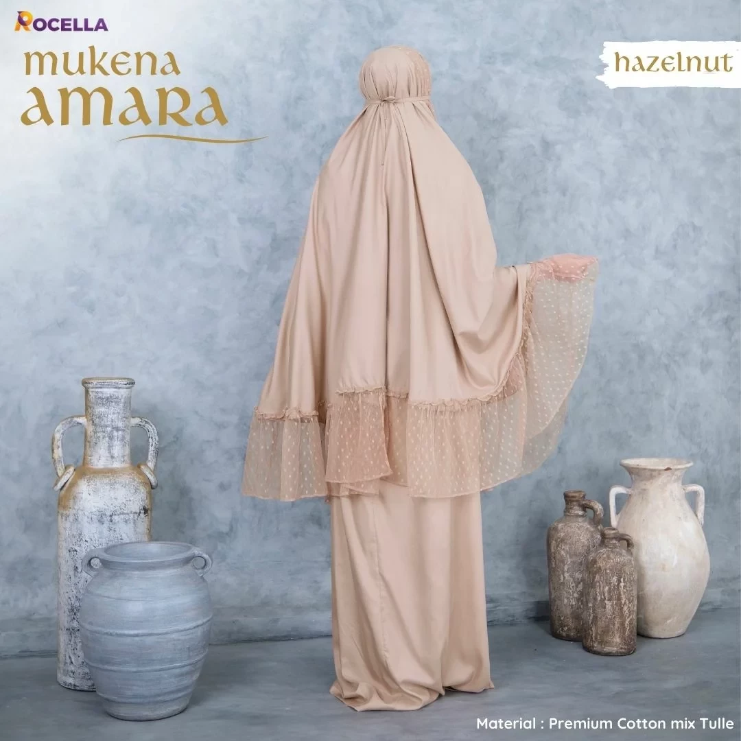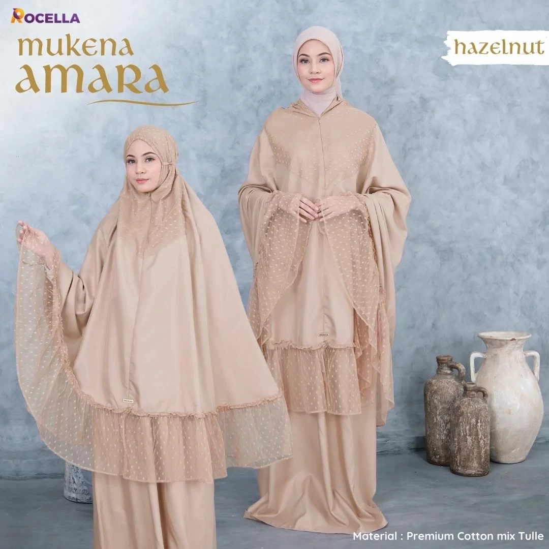 Rocella Mukena Amara Hazelnut, mukena 2 in 1 yang bisa digunakan dalam 2 model yaitu model reguler dan model ponco. Zipper di bagian dagu memungkinkan mukena ini untuk dipakai dalam 2 model tersebut. Setiap pembelian akan mendapatkan tas mukena sehingga memudahkan ketika dibawa bepergian.
