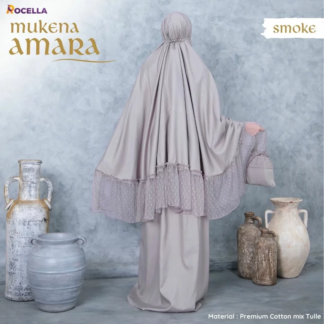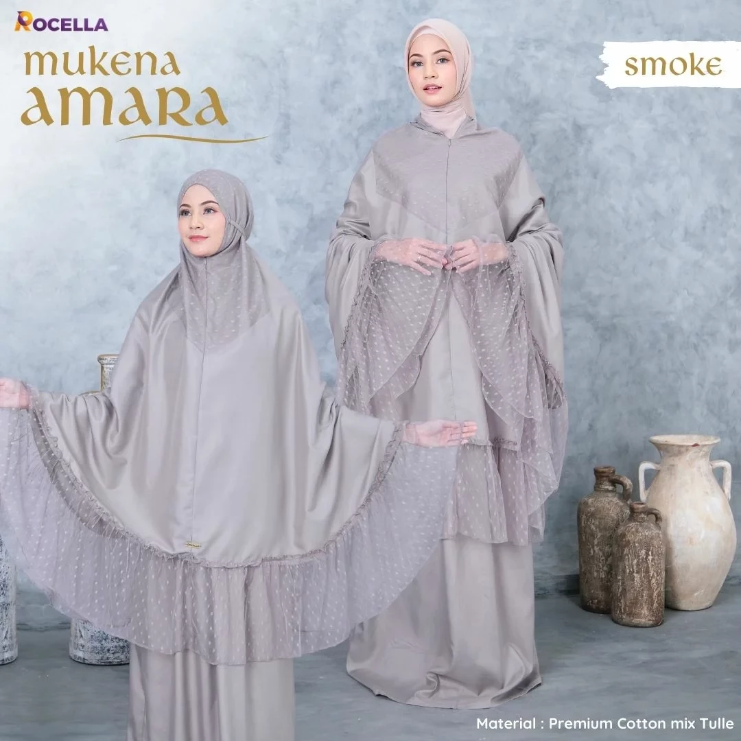 Rocella Mukena Amara Smoke, mukena 2 in 1 yang bisa digunakan dalam 2 model yaitu model reguler dan model ponco. Zipper di bagian dagu memungkinkan mukena ini untuk dipakai dalam 2 model tersebut. Setiap pembelian akan mendapatkan tas mukena sehingga memudahkan ketika dibawa bepergian.