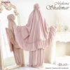 Mukena salimar dibuat menggunakan bahan Premium Silk mix Brukat. Bahan Premium Silk memiliki tekstur berkilau, halus, lembut dan tidak panas, dipadukan dengan bahan brukat dibagian atas yang membuat terlihat anggun dan mewah.
