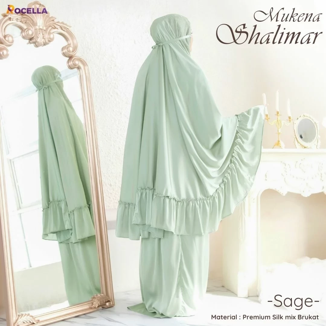 Rocella Mukena Shalimar Sage, mukena 2 in 1 yang menggabungkan model reguler dan model ponco. Mukena shalimar dilengkapi dengan zipper di bagian dagu yang berfungsi untuk mengubah model reguler ke model ponco maupun sebaliknya. Mukena salimar juga dilengkapi dengan tas mukena sehingga memudahkan untuk dibawa bepergian.