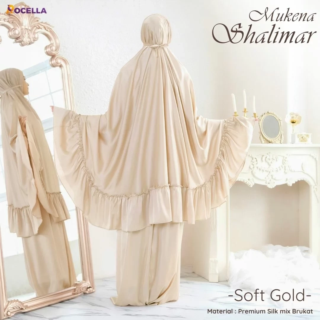 Rocella Mukena Shalimar Soft Gold, mukena 2 in 1 yang menggabungkan model reguler dan model ponco. Mukena shalimar dilengkapi dengan zipper di bagian dagu yang berfungsi untuk mengubah model reguler ke model ponco maupun sebaliknya. Mukena salimar juga dilengkapi dengan tas mukena sehingga memudahkan untuk dibawa bepergian.